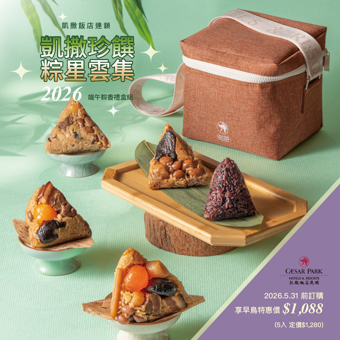 凱撒飯店連鎖2026年嚴選歷年銷售與顧客回饋熱銷口味再升級,結合葷食與素食雙重選擇,以「粽子界五大巨星」為概念,精心集結五款人氣風味,從鹹香經典、奢華饗宴、健康清爽、蔬食輕盈到甜蜜收尾,一次滿足不同口味及送禮需求。無論是節慶自享、家庭分享、或致贈長輩、客戶、同事與親友,都能輕鬆展現體面心意與品味質感。2026/5/31前訂購享 早鳥特惠價 NT$1,088 (定價NT$1,280,五入附贈精美保冷袋乙只)